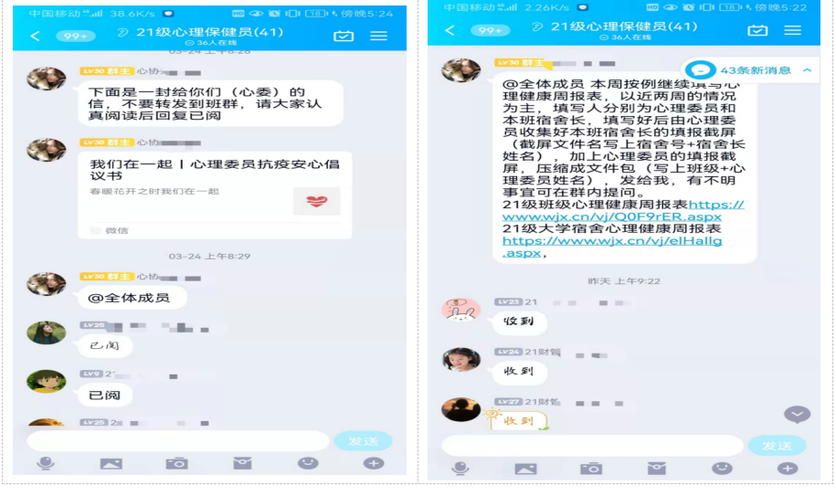 澳门十大电子官网以确保学生心理安全稳定为目标,将学生心理健康教育纳入到疫情防控整体工作中,准确把握学生心理动向,及早开展心理危机预防与干预。一是不断完善危机预防干预体系。学校构建了“学校—学院—班级—寝室”四级心理健康教育工作网络。在每个班级配备学生心理委员,每个寝室配备学生心理信息员,开展疫情防控心理健康知识宣传,并发布了《心理委员抗疫安心倡议书》,号召全体心理委员行动起来,积极主动了解疫情期间学生的心理健康状况,及时发现学生存在的心理问题,并在澳门十大电子官网所开通的线上“心理健康周报表”中填报或向辅导员及时报告,总体上形成相对闭合、齐抓共管、四级联动的教育工作体系和局面,使存在心理困扰的学生能够得到及时有效的帮助,增强了学校心理健康教育工作的辐射广度与强度。
