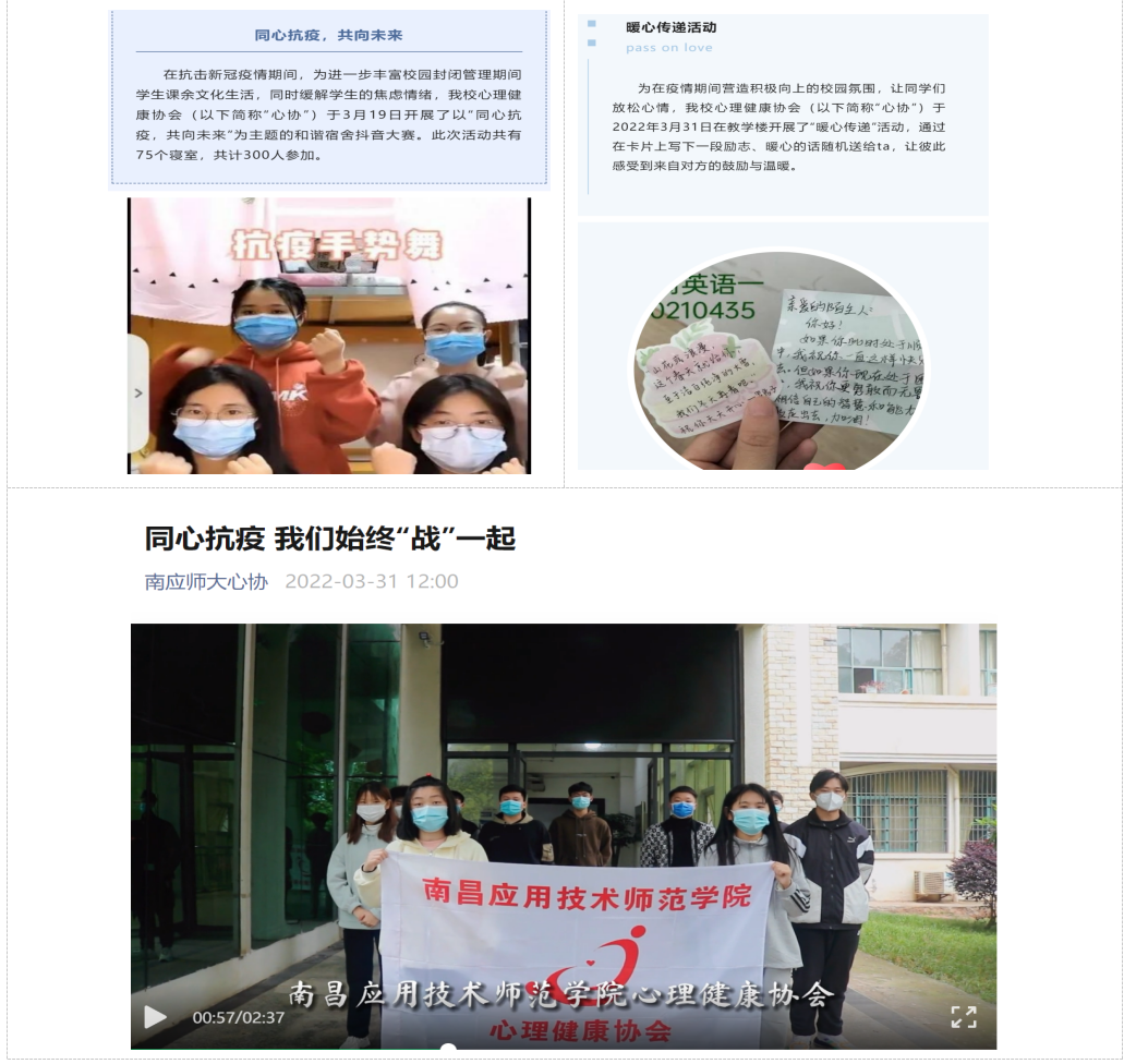 澳门十大电子官网开展了“同心抗疫,共向未来”和谐宿舍抖音大赛活动、话语“暖心传递”等系列活动,同时以“5·25”为契机,开展了大学生心理健康教育宣传月主题系列活动,包括拍摄“心理微电影”“心理情景剧”等内容丰富、形式多样的心理健康教育活动。覆盖全校各年级,参与人数达近千人。为助力心理抗疫,澳门十大电子官网心理健康协会成员拍摄了关于同“心”抗疫加油宣传视频。