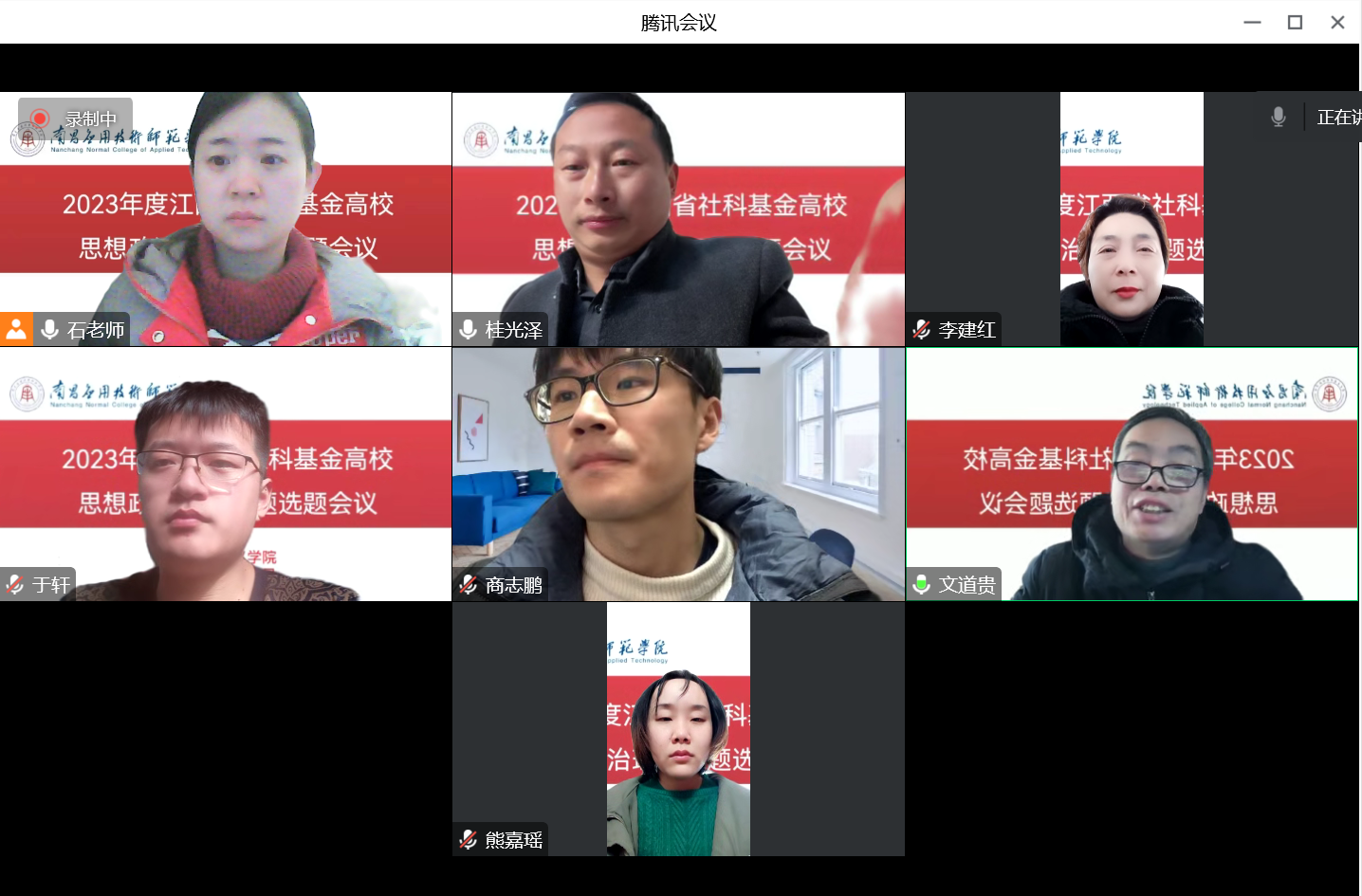 2023年1月20日,澳门十大电子正规游戏网站召开课题申报线上会议,澳门十大电子官网按照课题申报通知及学校党委指示,认真学习和研究江西省社会科学界联合会、江西省教育厅《关于组织开展2022年度江西省社科基金高校思想政治理论研究专项申报工作的通知》,积极组织澳门十大电子官网思政专职教师参加专项申报工作。会议由党总支副书记桂光泽主持,院长文道贵、思政教研室6位申报课题的专职教师参会。