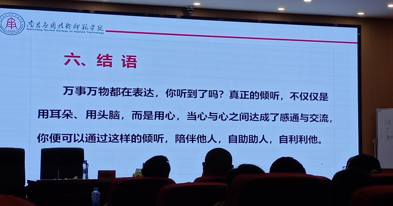 在课堂的最后,胡晓娥书记以自身为例子,通过分享自己在外出学习的经历,与学生们的交流互动中,让学生们明白倾听是要学会接纳和理解他人的需求,通过有效的沟通和心理支持,帮助他人解决问题、发展潜能,成长为更好的自己,而爱的陪伴和支持,不仅建立起人与人之间的信任和理解,更能为我们的成长之路注入温暖和动力的道理。
