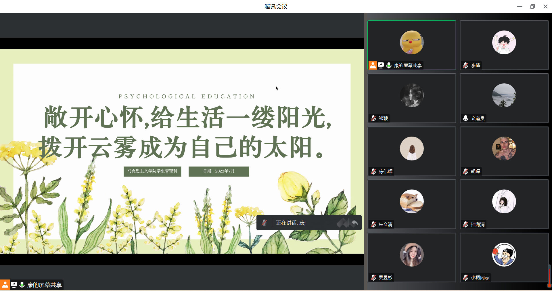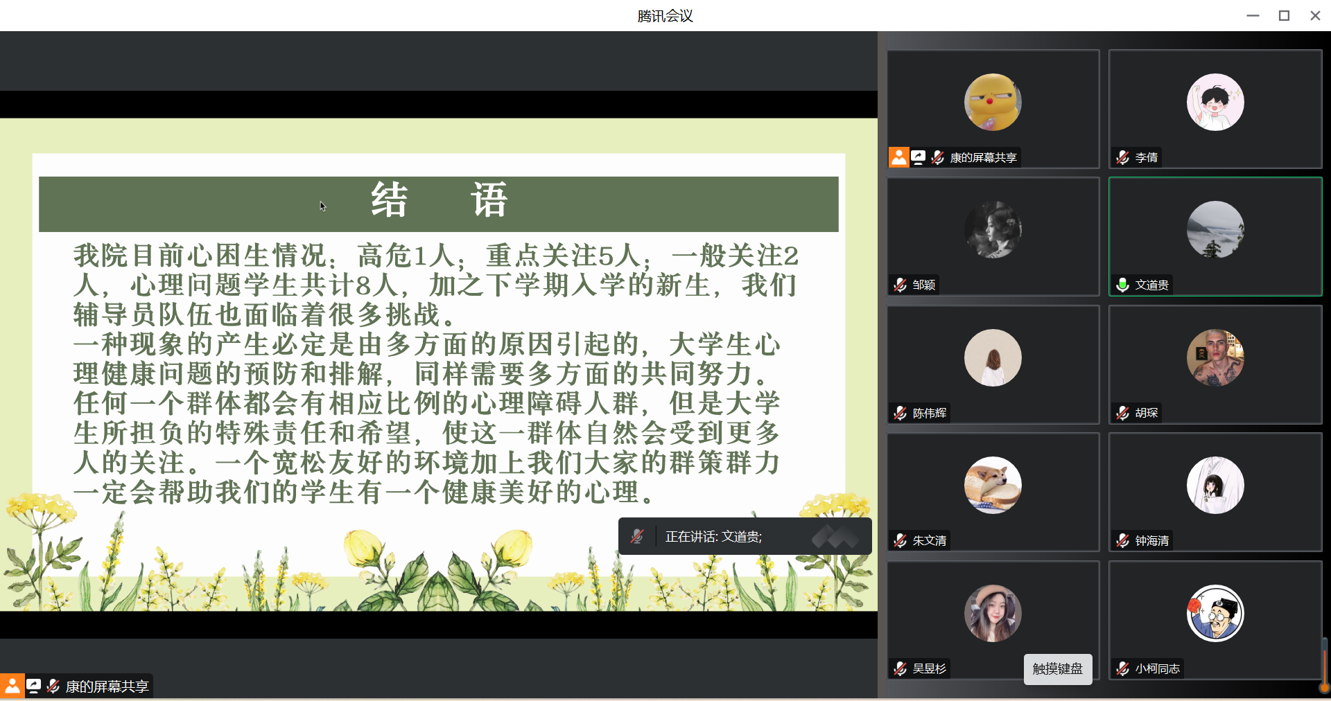 通过参加“心困生典型案例分享与工作方法交流”线上会议,辅导员们认识到:大学生担负着特殊的责任和希望,应该收到更多的关注,而大学生心理健康问题的预防和排解需要多方面的共同努力,一个宽松友好的环境加上大家的群策群力一定能帮助学生有一个健康美好的心理。(图文:李倩 审核:文道贵)