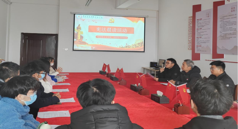 为进一步提高全体师生法律意识,引导学生深入了解宪法、尊崇宪法精神,增强法治观念,推动校园法治文化建设,澳门十大电子正规游戏网站于2023年12月4日上午9:30在1511会议室组织开展了“宪法晨读”活动,活动由法学教研室主任李水根主持,院长文道贵、党总支书记张欣康、党总支副书记李婷、副院长张丹、法学教研室部分专任老师以及法学班20名学生参加。