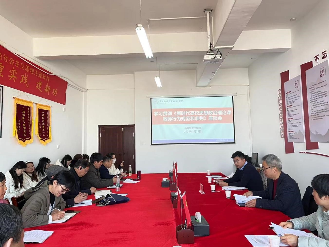 2024年1月12日,澳门十大电子正规游戏网站举办学习《新时代高校思想政治理论课教师行为规范和准则》座谈会。院长文道贵主持会议,学院领导班子、全体教职工参加。