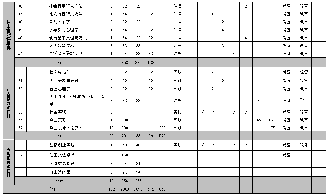 学位课程:大学英语、计算机应用基础、法学概论、马克思主义基本原理、毛泽东思想和中国特色社会主义理论体系概论、科学社会主义理论、世界政治经济与国际关系、马克思主义经典著作选读、社会学原理、管理学原理、思想政治教育学原理、政治学原理、西方经济学、中国哲学史、学与教的心理学、教育基本原理与方法、中学政治课教学论