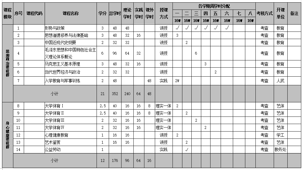 1、思想政治素质:培养热爱社会主义祖国,拥护中国共产党领导,认真学习马克思列宁主义、毛泽东思想、邓小平理论、‘三个代表’重要思想、科学发展观、习近平新时代中国特色社会主义思想;有为国家繁荣、民族昌盛而奋斗的志向和责任感;具有敬业爱岗、艰苦奋斗、乐于奉献、遵纪守法、团结合作的品质;具有良好的思想品德、社会公德和职业道德。