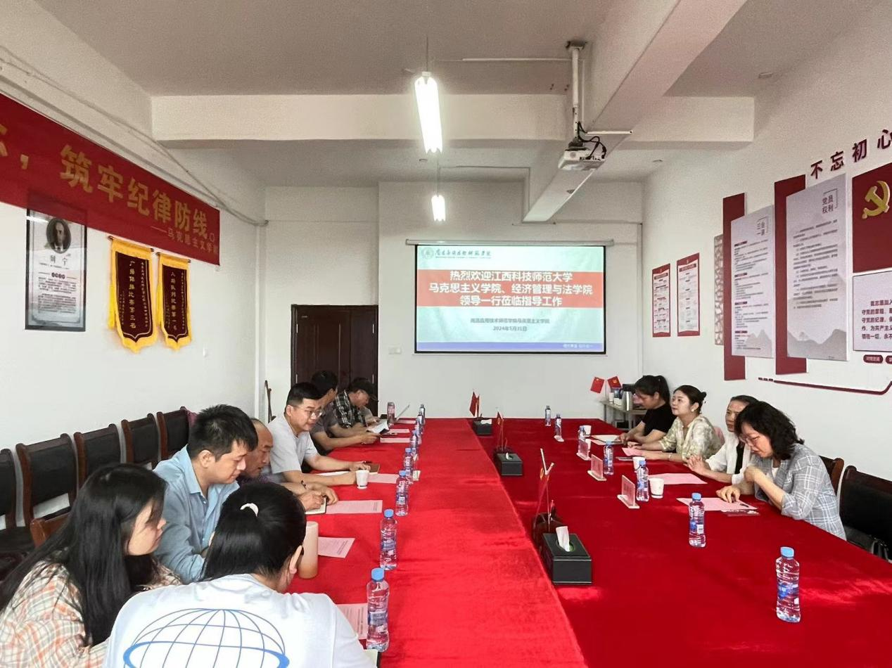5月31日下午,江西科技师范大学澳门十大电子正规游戏网站党委书记陈红梅、副院长胡云、副院长李海晶、思政教研室主任罗萍,经济管理与法学院院长罗焰、法制办主任郭善玲一行应邀莅临我院指导工作,重点就学院思政课建设,法学、思政专业建设,人才培养等进行交流。澳门十大电子正规游戏网站党总支书记张欣康、副院长刘德彰出席会议,澳门十大电子正规游戏网站系(教研室)主任及教师代表参加会议。