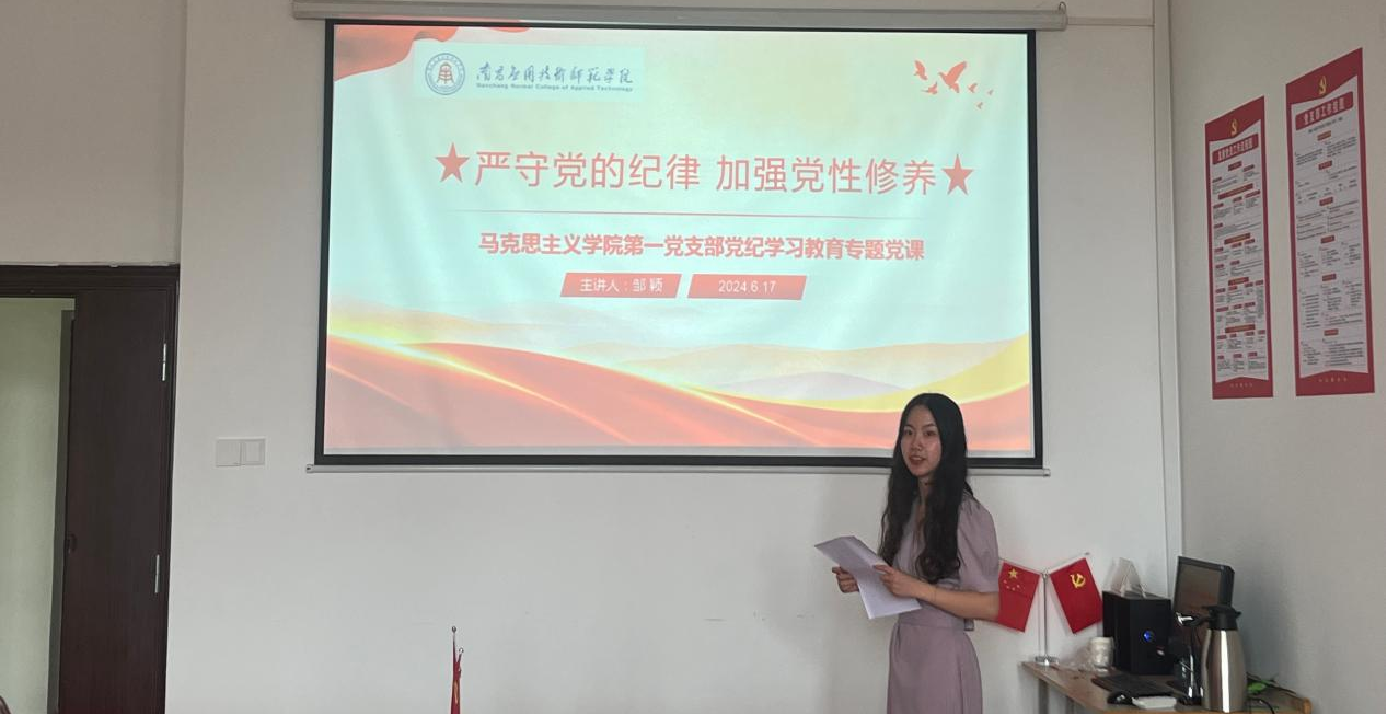 2024年6月17日,澳门十大电子正规游戏网站第一党支部在1511会议室开展主题为“严守党的纪律 加强党性修养”的党纪学习教育专题党课,由支部书记邹颖授课,校党委副书记蓝贤发出席会议。