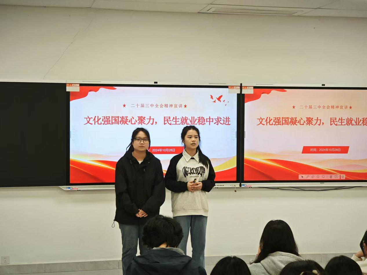 澳门十大电子正规游戏网站“星火宣讲团”在10月28日为2024级思想政治教育专业的同学们带来了一场以“文化强国凝心聚力,民生就业稳中求进”为主题的党的二十届三中全会精神宣讲。