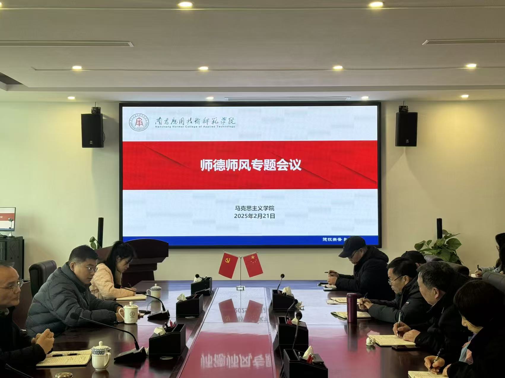根据学校党委教师工作部下发的《关于做好2025年春季开学前后教职工安全教育培训暨思想动态调研的通知》要求,2月21日上午,学院于赣新校区沁苑7实506会议室召开学院师德师风专题会议。校党委副书记蓝贤发出席会议,党总支书记张欣康、党总支副书记李婷、副院长刘德彰,及全体教职工参加会议,会议由党总支书记张欣康主持。