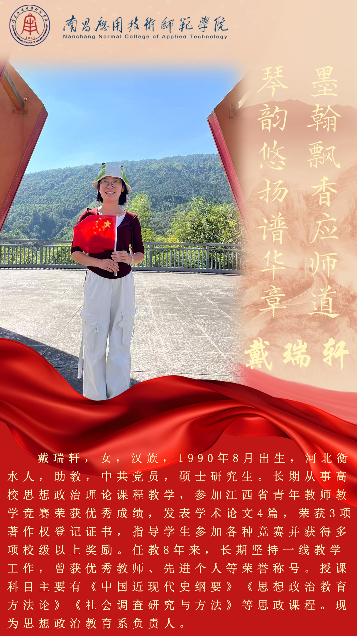 先进典型 优秀毕业生 优秀在校生 优秀教职工 您现在的位置是:首页 > 先进典型 > 优秀教职工 戴瑞轩 思想政治教育系主任 管理员2025-06-091740 上一篇 龚三妹 法学系主任 下一篇 邹颖 最美辅导员