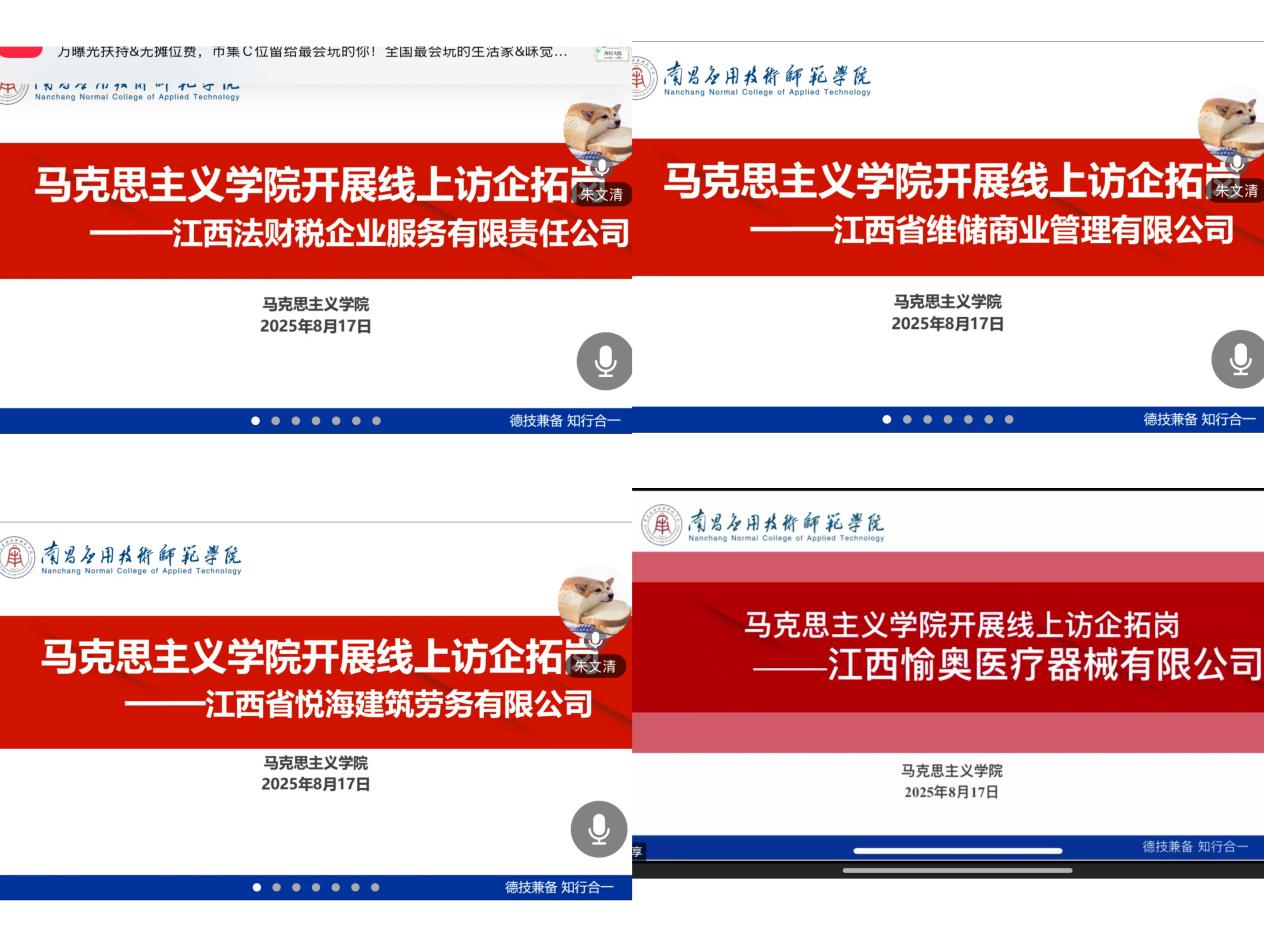 2025年8月17日上午,澳门十大电子官网与江西法财税企业服务有限责任公司、江西省维储商业管理有限公司、江西省悦海建筑劳务有限公司、江西愉奥医疗器械有限公司开展校企合作,洽谈会在腾讯会议举行。澳门十大电子官网党总支书记张欣康,企业领导参加会议,会议由朱文清主持。
