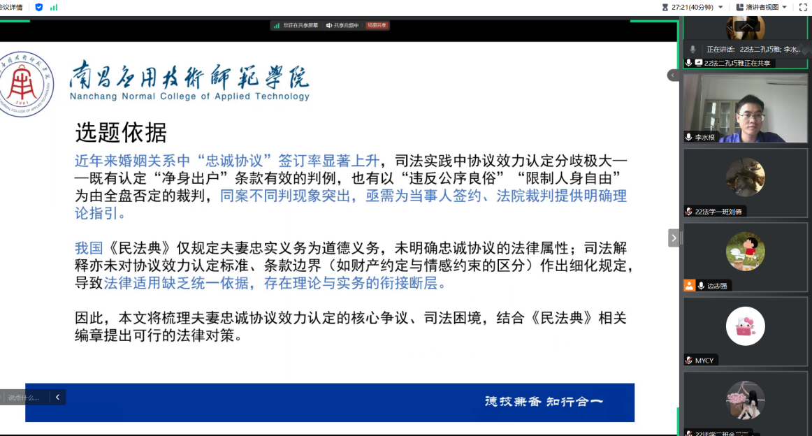 为切实做好2026届毕业论文指导工作,10月14日,澳门十大电子正规游戏网站举行了2026届毕业生毕业论文线上开题报告会。法学、思想政治教育两个专业共计341名毕业生进行了开题报告,全体论文指导教师听取了报告。