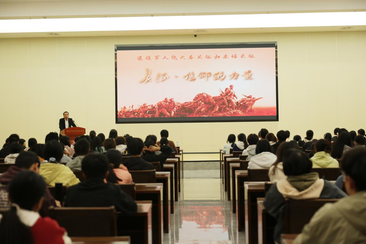 11月11日晚上,一堂主题为《长征:信仰的力量》的特殊“红色思政课”在学校致真楼第一会议室顺利举行,200余名师生齐聚现场,共同接受精神洗礼。副校长兼澳门十大电子正规游戏网站院长娄全福出席并主持活动,退役军人饶大春,革命先辈杨上堃将军之子杨国兴受邀担任主讲嘉宾。